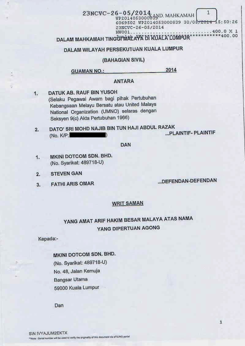 Perdana Menteri Datuk Seri Najib Tun Razak Memfailkan Saman Terhadap Portal Berita Malaysiakini Berhubung Penerbitan Dua Artikel Berunsur Fitnah Best Fbkl